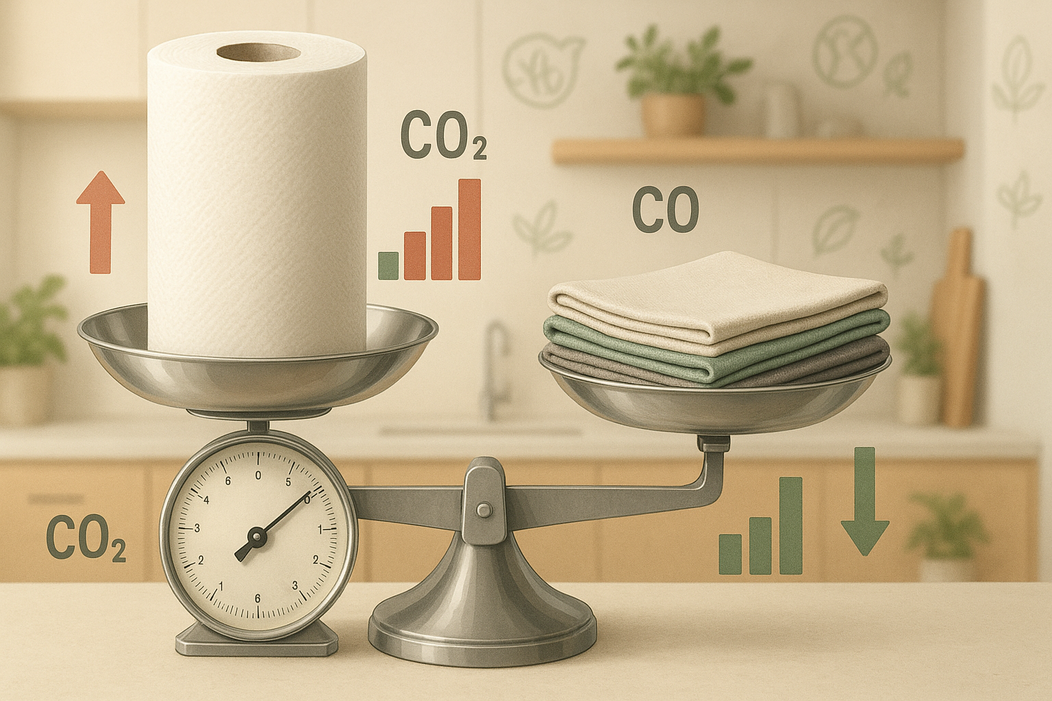 | Servilletas/trapos de tela reutilizables | 15 trapos (1,5 kg algodón a 7 kg CO₂e/kg, vida útil 3 años) + 52 lavados/año | ≈ 8,7 kg CO₂e/año |